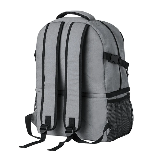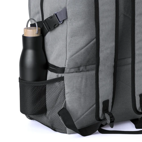 Mochila multiusos fabricada en resistente poliéster 600D RPET, con un diseño urbano y práctico. Destaca por su compartimento isotérmico independiente en la base, forrado con PEVA para mantener la temperatura. El compartimento principal se cierra con cremallera, de doble tirador, y cuenta con bolsillos frontales y laterales de malla para mayor versatilidad. Las cintas de hombros son acolchadas y ajustables. Además, dispone de un asa de mano acolchada en la parte superior. Etiqueta distintiva de RPET. Presentada individualmente en bolsa reciclada.El material RPET se elabora a partir de plástico reciclado, para así fomentar la reutilización de residuos plásticos y ayudar a la sostenibilidad del planeta.