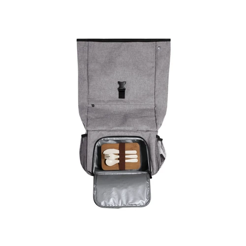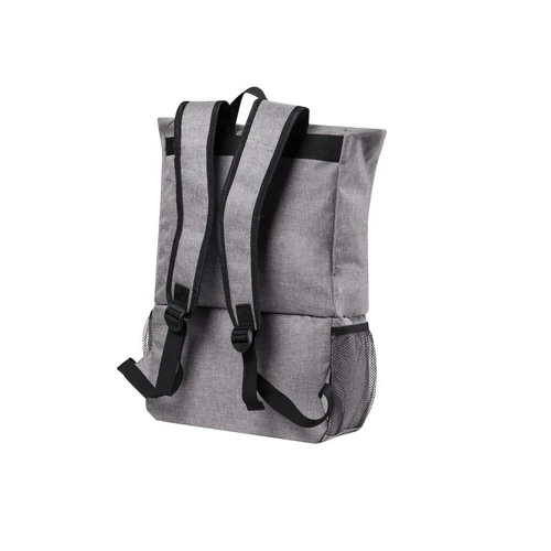Mochila multiusos en resistente poliéster 600D de acabado denim. De diseño urbano, incluye compartimento isotérmico independiente con cobertura de PEVA para fiambrera. Compartimento principal con cierre de seguridad de hebilla y bolsillos laterales de redecilla. Con cintas de hombros acolchadas, de ajuste regulable.