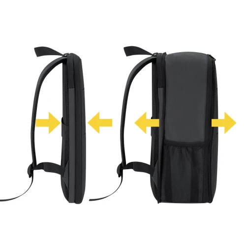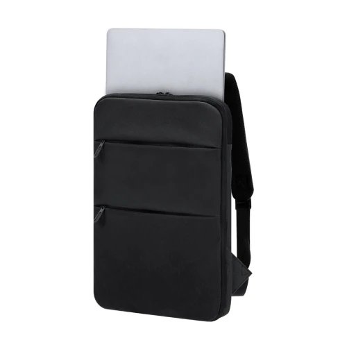 Mochila extensible confeccionada en resistente PU/ poliéster 600D. Equipada con cierre de cremallera de doble tirador, con posibilidad para ampliar la capacidad. Con dos compartimentos frontales y compartimento interior acolchado para portátil de hasta 15 pulgadas. Bolsillo lateral. Cómodas cintas de hombros acolchadas, transpirables y ajustables. Incluye cinta para fijarla en trolley y maletas.