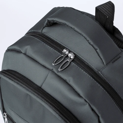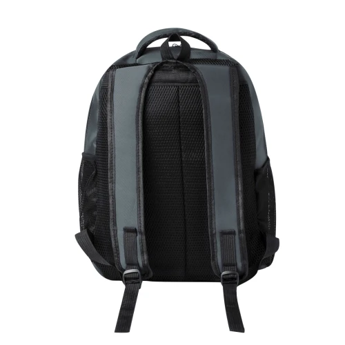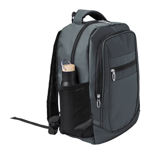 Mochila confeccionada en resistente 600D Nylon. Cuenta con un bolsillo principal con cierre de cremallera, y doble tirador. Interior con bolsillos acolchados destinados a tablet de hasta 10 pulgadas y portátil de hasta 15 pulgadas. Además, lleva dos bolsillos frontales adicionales. Tanto la espalda como las cintas de hombros son acolchadas y ajustables, fabricadas con un tejido transpirable. Presenta una cómoda cinta superior acolchada y bolsillos laterales de rejilla. Disponible en elegantes colores, con complementos en negro. Presentado en una bolsa individual.