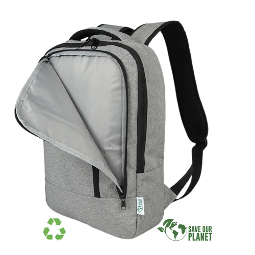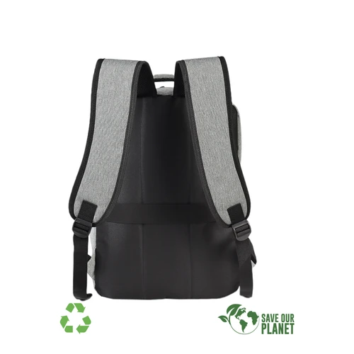 Mochila Porta-Notebook modelo "ECO". Fabricada en material reciclado PONGEE-RPET bitono, eco-cuero 210D/PU y poliéster 300D/PU. Capacidad 12.5 litros, tamaño 30 x 41.5 x 10 cm. Incluye compartimento interior reforzado y acolchado para Laptop y doble bolsillo delantero.