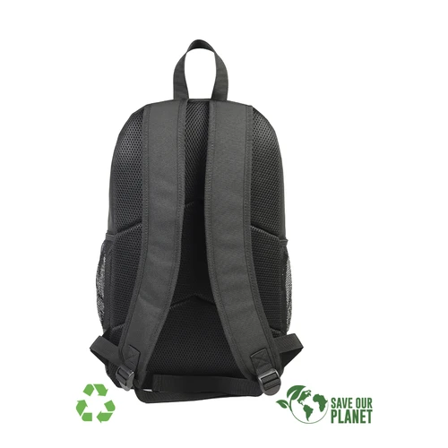 Mochila Porta-Notebook modelo "RPET". Fabricada en material reciclado RPET y poliéster 250D/PVC. Capacidad 20 litros, tamaño 29 x 48 x 14.5 cm. Incluye compartimento interior reforzado y acolchado para Laptop, bolsillo delantero y 2 bolsillos laterales con malla.