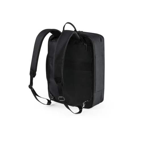 Mochila portadocumentos en combinación de resistente poliéster 300D con detalles en polipiel. De diseño urbano, compartimento principal con cierre de cremallera de doble tirador y bolsillo acolchado para portátil de hasta 15 pulgadas. Con cintas de hombros y espalda acolchadas, de ajuste regulable. Con accesorio para ajuste en trolley y bolsillo para ocultar las cintas de la espalda cuando se usa como portadocumentos.