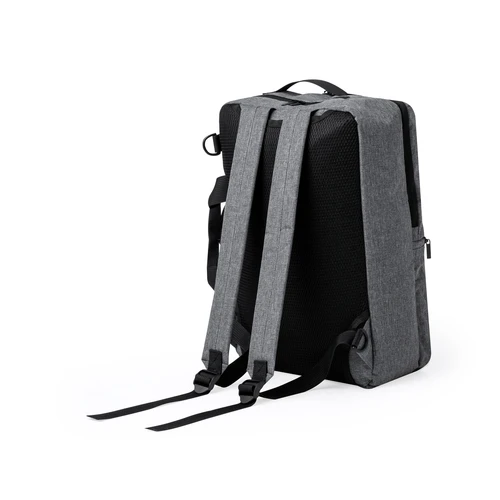 Mochila portadocumentos confeccionada en resistente 600D RPET. Presenta un diseño urbano que incorpora un bolsillo central con cierre de cremallera, y doble tirador. Con interior acolchado para portátil de hasta 15 pulgadas, bolsillo adicional con cierre de doble cremallera y bolsillo frontal. Sus cintas de hombros y la espalda están acolchadas y son ajustables para mayor comodidad. Ofrece tres modalidades de transporte: como mochila, gracias a las tiras de hombros colchadas; como portadocumentos, gracias a su asa de transporte acolgada; y como bandolera gracias a su asa larga ajustable. Está disponible en tres elegantes colores y se presenta de manera sofisticada en una bolsa individual reciclada.El material RPET se elabora a partir de plástico reciclado, para así fomentar la reutilización de residuos plásticos y ayudar a la sostenibilidad del planeta.