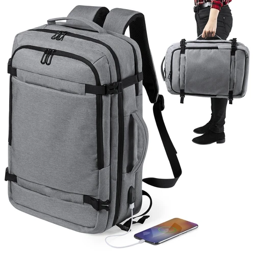 Mochila portadocumentos en resistente poliéster 600D de acabado denim. En diseño urbano, con bolsillo antirrobo, incluye conexión USB para carga de dispositivos móviles (cable incluido, batería auxiliar no incluida) y bolsillo acolchado para portátil de hasta 17 pulgadas. Refuerzos en fuelles con cierre de hebilla de seguridad y compartimentos con cierre de cremallera de doble tirador, con cintas de hombros y espalda acolchadas, de ajuste regulable. Accesorio para ajuste en trolley y bolsillo para ocultar las cintas de la espalda cuando se usa como portadocumentos.