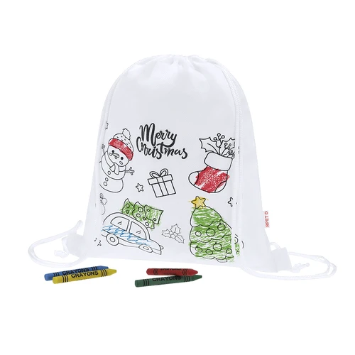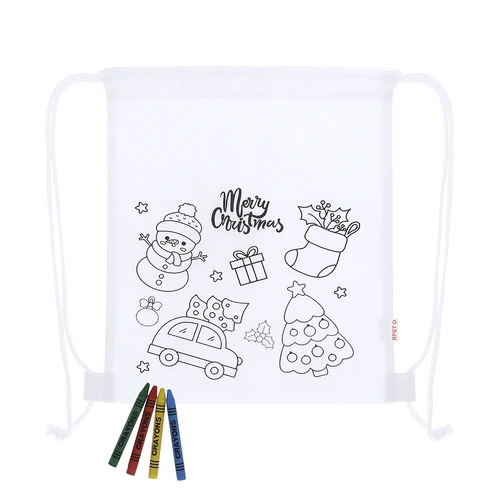 Mochila infantil con motivos navideños fabricada en non-woven RPET. Especialmente diseñada para colorear con ceras. Con 4 ceras en variados colores. Cuenta con cuerdas de autocierre y sujeciones de tela. Incluye distintivo RPET en etiqueta.El material RPET se elabora a partir de plástico reciclado, para así fomentar la reutilización de residuos plásticos y ayudar a la sostenibilidad del planeta.