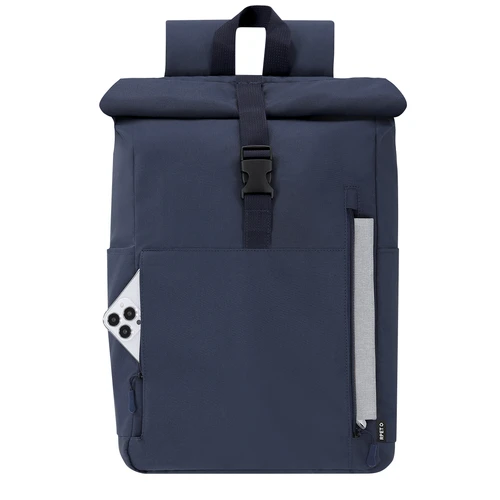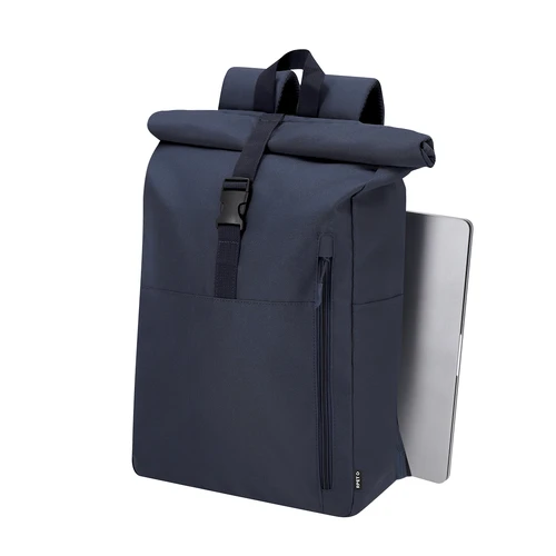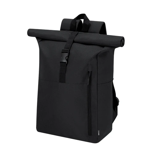 Mochila confeccionada en resistente RPET 300D. Con sistema de cierre enrollable y hebilla. Dispone de dos bolsillos frontales, un bolsillo trasero con acceso lateral y dos bolsillos laterales adicionales. Interior de gran capacidad con compartimento interior acolchado para portátil de hasta 15 pulgadas. Cintas de hombros y espalda acolchachadas. Incluye cinta de transporte para ajuste en trolley o maleta, ideal para viajes y desplazamientos. El material RPET se elabora a partir de plástico reciclado, para así fomentar la reutilización de residuos plásticos y ayudar a la sostenibilidad del planeta.