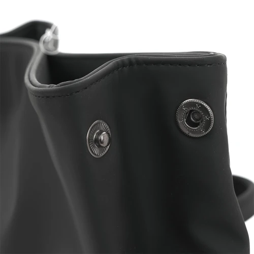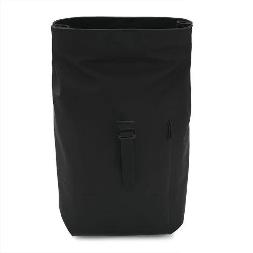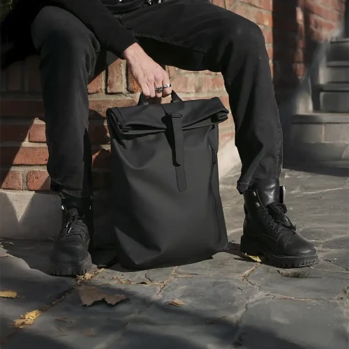 Mochila con cierre enrollable y acceso frontal. Está confeccionada en PU. Cuenta con apertura superior con tira y hebilla, bolsillo con cierre al frente, espalda acolchada y correas ajustables. Incluye manija superior y diseño compacto.