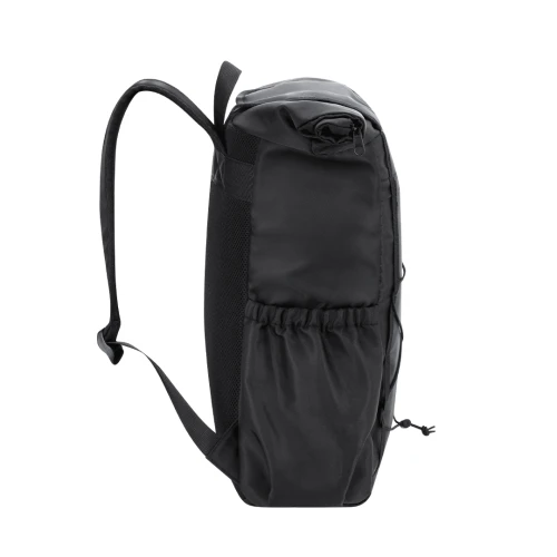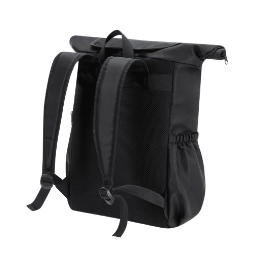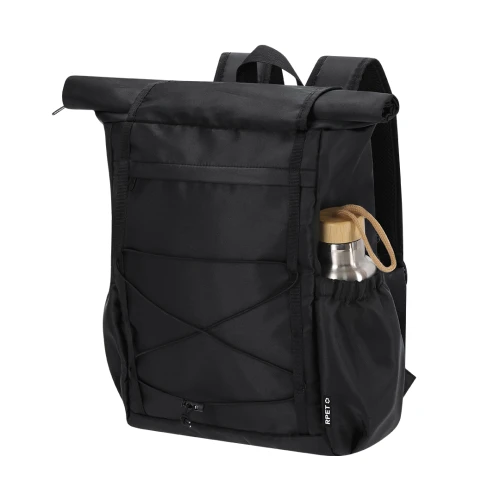Mochila confeccionada en poliester RPET 290D con sistema de cierre enrollable de cremallera y un segundo cierre de velcro. Dispone de un bolsillo frontal con cremallera invisible, así como cuerda elástica ajustable en el frontal. Dos bolsillos laterales adicionales. Interior de gran capacidad con compartimento acolchado para portátil de hasta 15 pulgadas. Cintas de hombros y espalda acolchadas para mayor comodidad. Logotipo RPET en etiqueta exterior.