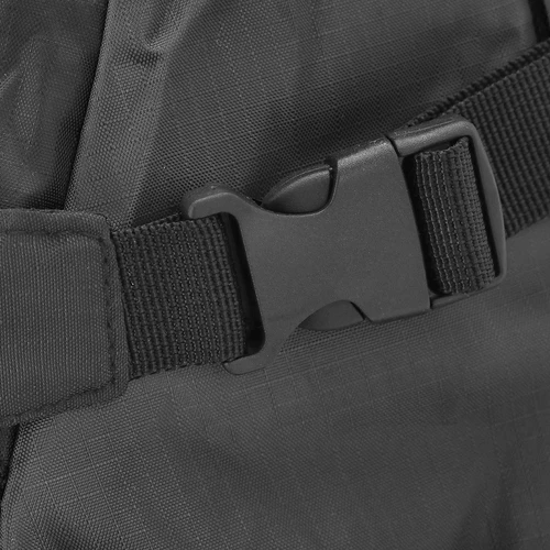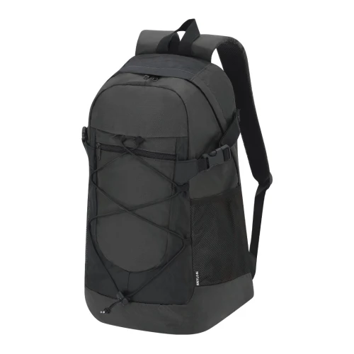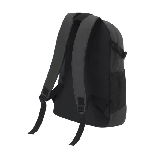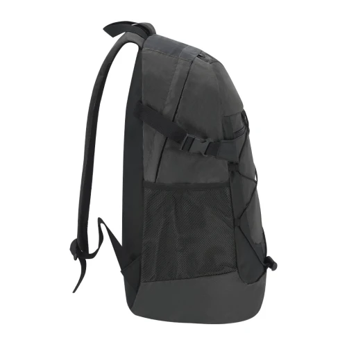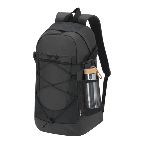 Mochila confeccionada en resistente Nylon Reciclado Ripstop. Cuenta con un bolsillo principal con cierre de cremallera, y doble tirador. Un bolsillo en la parte frontal con cremallera metalizada en negro. Las cintas para los hombros son acolchadas y ajustables. Presenta bolsillos de rejilla en los laterales y cintas ajustables que permiten compactar el volumen según necesidad, así como cuerda elástica ajustable en el frontal.