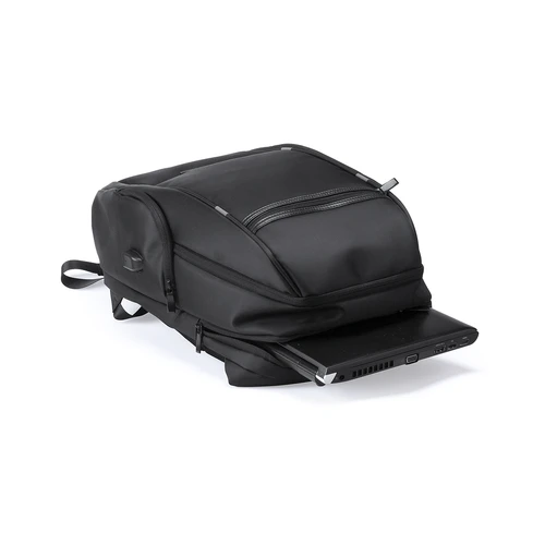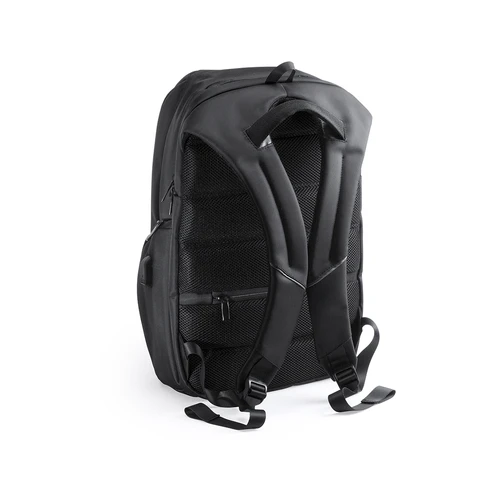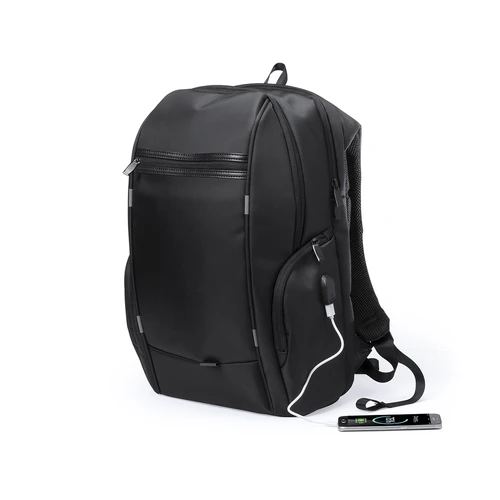 Elegante mochila de negocios resistente al agua en nylon de alta calidad. Con compartimento interior con salida USB para conexión de powerbank -no incluido-, incluye cable micro USB de 1 metro de largo para total comodidad en la carga de cualquier dispositivo móvil. Con compartimento interior acolchado para ordenador portátil de hasta 15 pulgadas y multitud de bolsillos interiores y exteriores. Cintas de hombros y espalda con acolchado ergonómico.