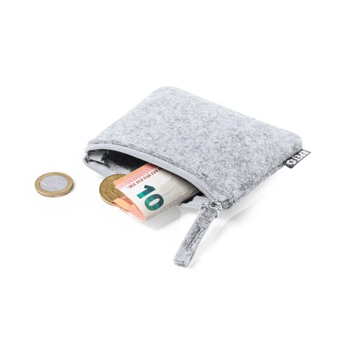 Elegante monedero fabricado en fieltro RPET. Compartimento principal con cierre de cremallera y tirador a juego. Con distintivo fieltro RPET en la etiqueta exterior. El fieltro RPET es fruto de la combinación del proceso de reciclaje de materiales plásticos junto con la técnica milenaria de fabricación del fieltro, dando como resultado un material de eco-tendencia que, además de ser de origen reciclado, también se convierte en reciclable.