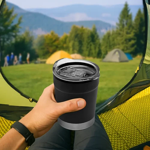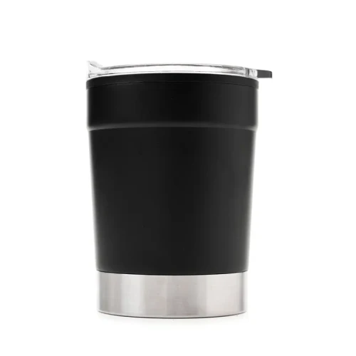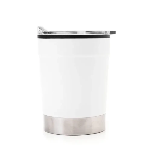 Mug térmico realizado en acero inoxidable en su exterior, y polipropileno de color negro en su interior, con tapa transparente cristal clear con cierre. Producto libre de BPA. Interior realizado en plástico. Medidas: 12 cm x Diámetro 8.5 cm. Capacidad: 360 ml