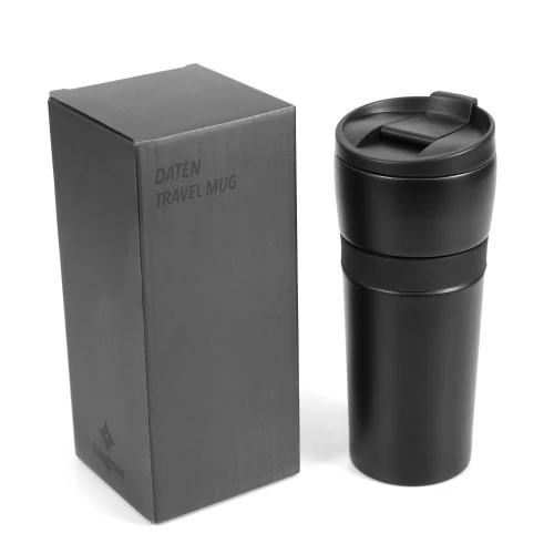 Mug térmico de doble pared en acero inoxidable. Cuenta con terminación exterior en color negro mate. Posee grip de silicona antideslizamiento y Cierre hermético y boca para tomar con traba a presión y silicona para evitar derrames. Interior de acero inoxidable.