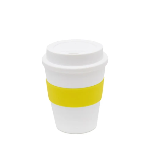Vaso reutilizable fabricado en polipropileno con banda de silicona personalizable.