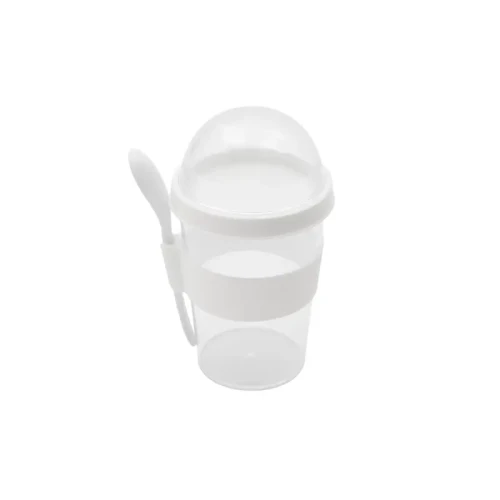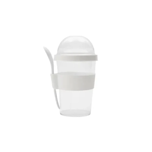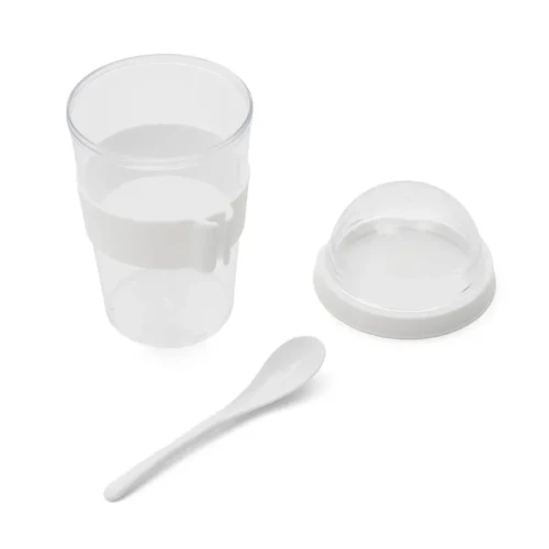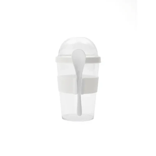 Jarro con compartimento superior y cuchara, fabricado en plástico PS con tapa de polipropileno y grip de silicona. Cuenta con domo transparente para cereales o toppings y cuchara incluida. Es ideal para desayunos saludables y prácticos fuera de casa, en la oficina o en viajes.