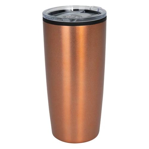 Mug metálico doble pared aislante, interior plástico PP, exterior Acero inoxidable 201 SS, recubierto con pintura POWDER COAT color cobre. Producto BPA FREE, para el contacto con líquidos y alimentos. Fondo de silicona negra ABS anti-deslizante. Tapa removible de plástico PS Crystal Clear con sello cilíndrico de silicona. Capacidad 600ml. Presentación en bolsa PP + caja de regalo de cartón negro.