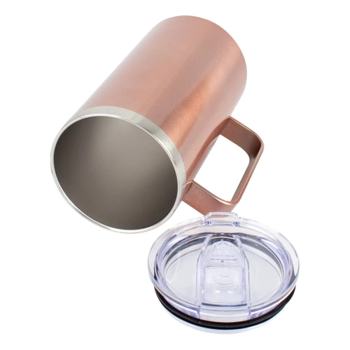 Mug térmico metálico doble pared aislante, asa y cubierta lisa en acabado color cobre, interior Acero inoxidable 304 SS, exterior Acero inoxidable 201 SS. Producto BPA FREE, para el contacto con líquidos y alimentos. Tapa removible de plástico PET Crystal Clear con sello cilíndrico de silicona y sistema de cierre/apertura antiderrame. Capacidad 700ml. Presentación en bolsa burbuja + caja de regalo de cartón laminado negro.