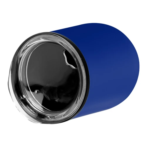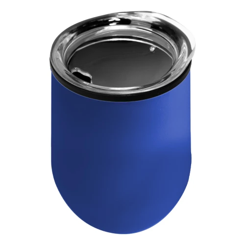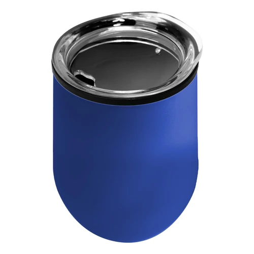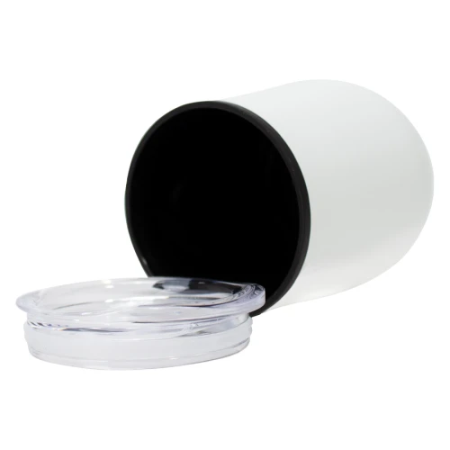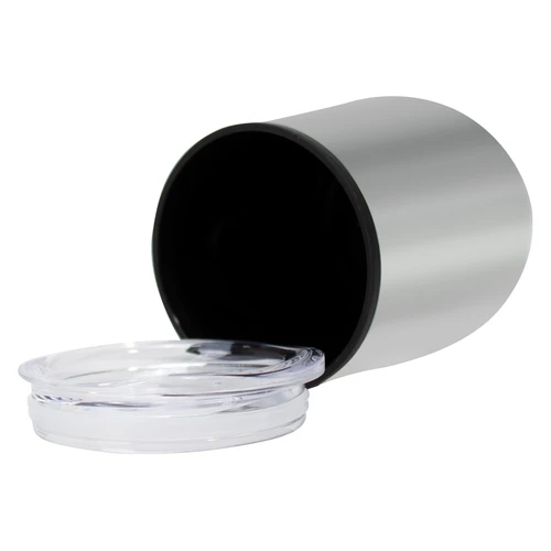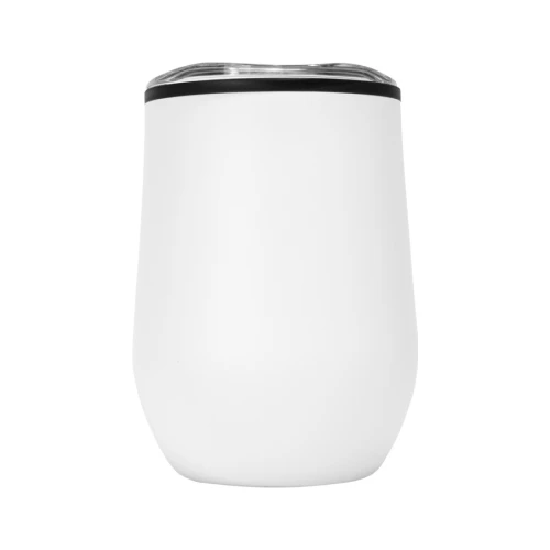 Mug metálico doble pared aislante, interior plástico PP, exterior Acero inoxidable 201 SS, recubierto con pintura POWDER COAT, modelo "SYNNA". Producto BPA FREE, para el contacto con líquidos y alimentos. Fondo de silicona negra ABS anti-deslizante. Tapa removible de plástico PS Crystal Clear con sello cilíndrico de silicona. Capacidad 350ml. Presentación en bolsa PP + caja de regalo de cartón negro.