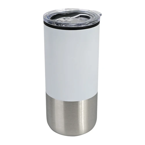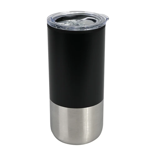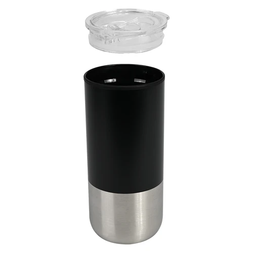 Mug metálico bicolor doble pared aislante, interior plástico PP, exterior plástico PP con pintura POWDER COAT, combinado con Acero inoxidable 201 SS, modelo "THEO". Producto BPA FREE, para el contacto con líquidos y alimentos. Fondo de silicona negra ABS anti-deslizante. Tapa removible de plástico PS Crystal Clear con sello cilíndrico de silicona. Capacidad 450ml. Presentación en bolsa PP + caja de regalo de cartón negro.