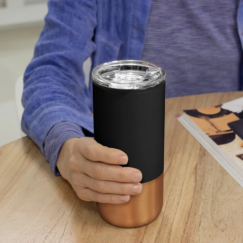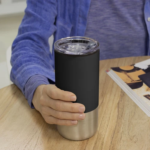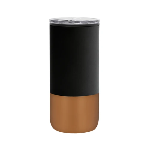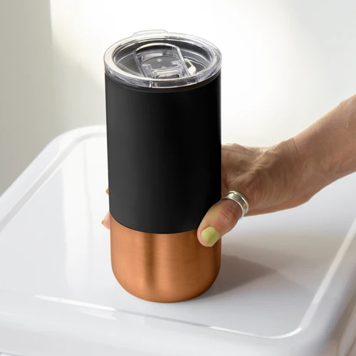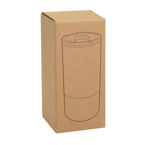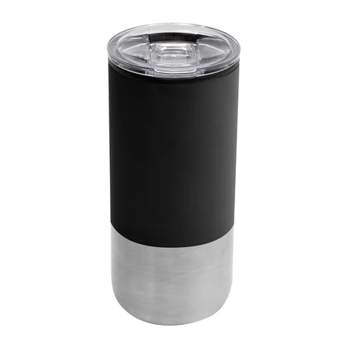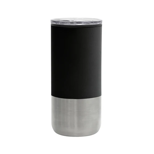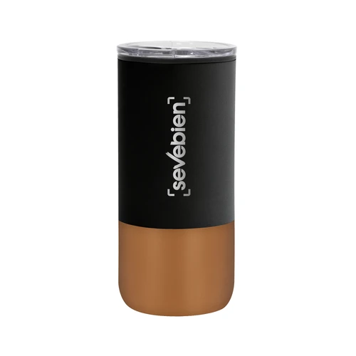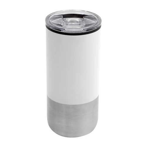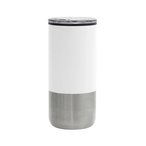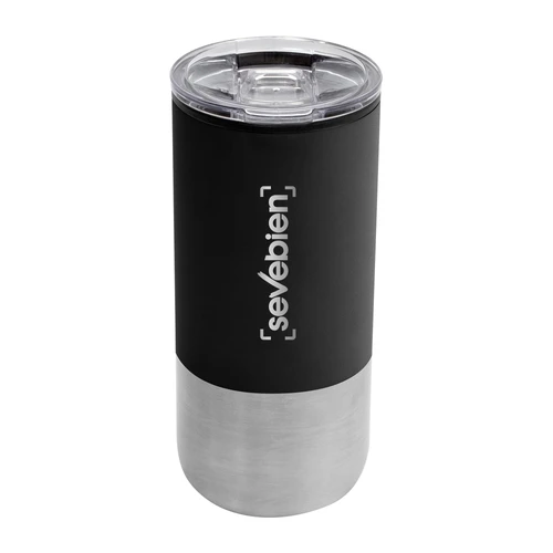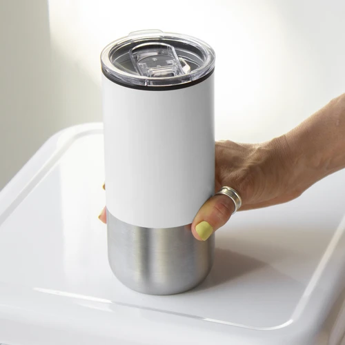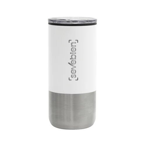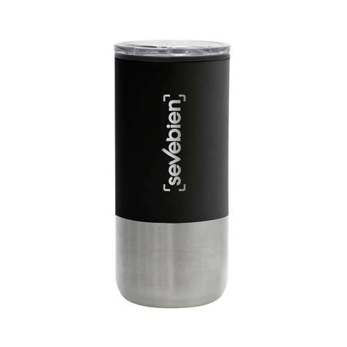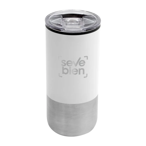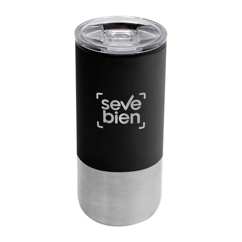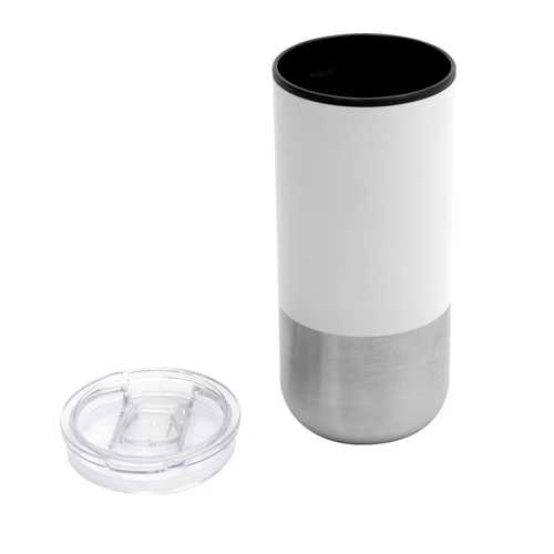 Ø 8 cm X 17.6 cm. Capacidad 500 ml. Polipropileno y acero inoxidable. Mug doble pared. Interior en plástico y exterior de acero inoxidable 201. Tapa plástica transparente a presión con anillo de silicona. Base antideslizante. Presentación en caja de regalo.