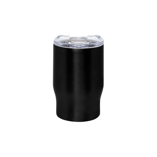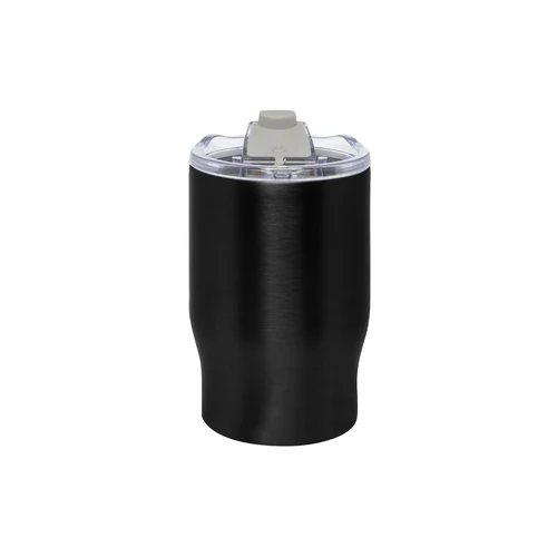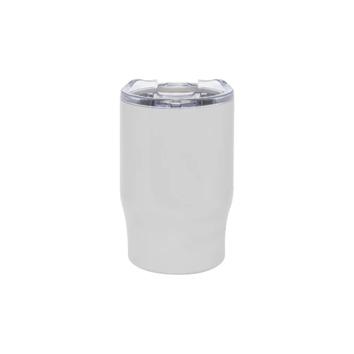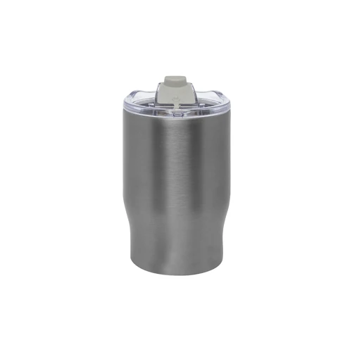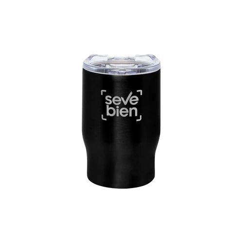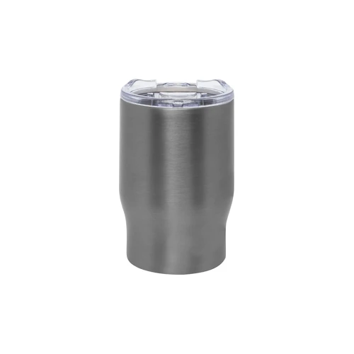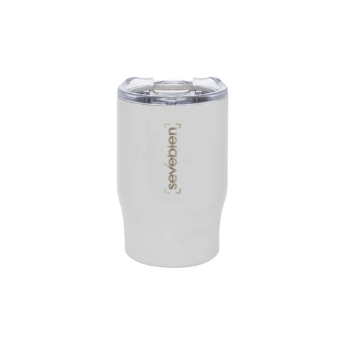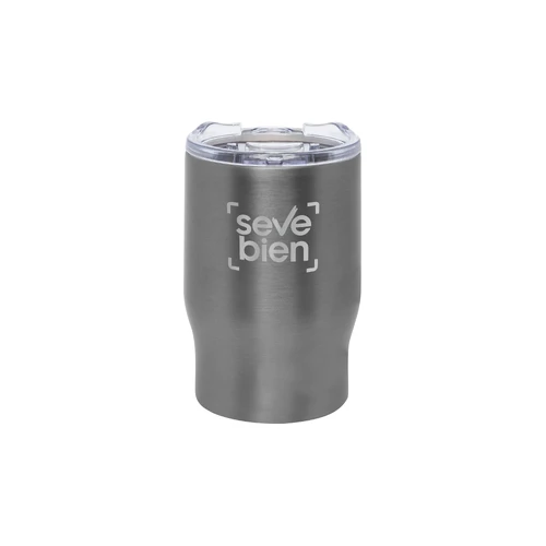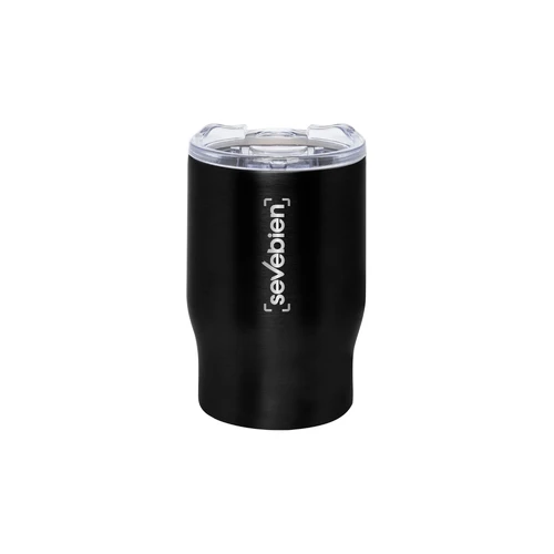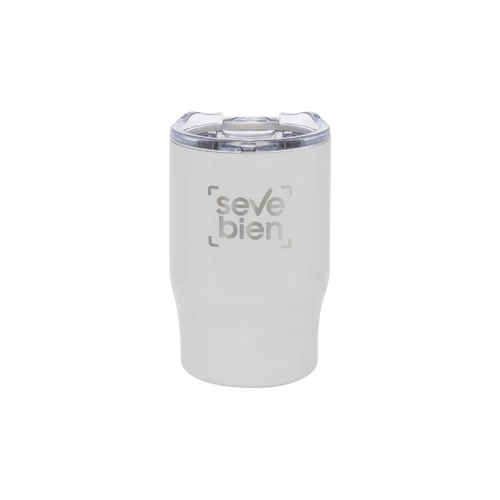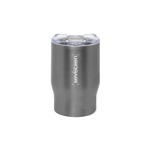Ø 8,5 x 13,3 cm. Capacidad 350 ml. Acero inoxidable. Mug doble pared. Interior de acero 304 y exterior de acero 201. Tapa plástica transparente a presión con anillo de silicona. Mantienen las bebidas frías y calientes por más tiempo. No utilizar con bebidas gaseosas. Presentación en caja de regalo.