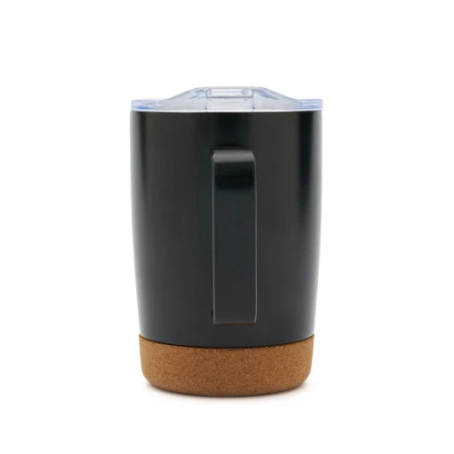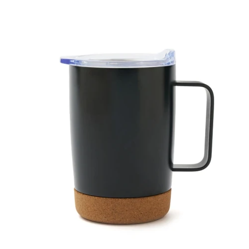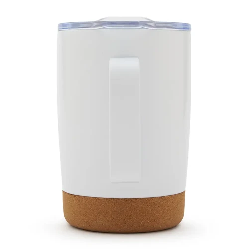 Mug de 350 ml. Con su diseño de doble pared y base de corcho, mantiene la temperatura de tus bebidas por más tiempo, mientras que su tapa anti derrame ofrece una mayor comodidad y seguridad en el uso diario. Además, cuenta con una manija ergonómica que facilita el agarre y el transporte.