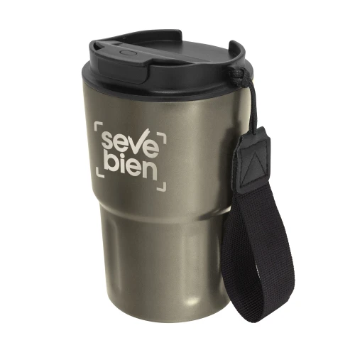 Disfruta cada sorbo, donde sea.Mug doble pared, sellado al vacío. Mug con aislamiento térmico. Tecnología vacuum. Interior en acero 304 y exterior en acero 201. Tapa de polipropileno con anillo de silicona y correa de poliéster en color negro. Pintura acabado mate. Mantiene hasta 8 hs la temperatura de las bebidas calientes y hasta 12 hs la de las bebidas frías. Medidas: Ø 8,8 cm x 14,5 cm.