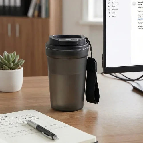 Jarro de polipropileno con tapa y correa. Cuenta con tapa ajustable, correa para transporte y diseño ergonómico. Es ideal para transportar bebidas calientes o frías en la oficina, durante viajes o actividades al aire libre gracias a su diseño práctico y resistente.