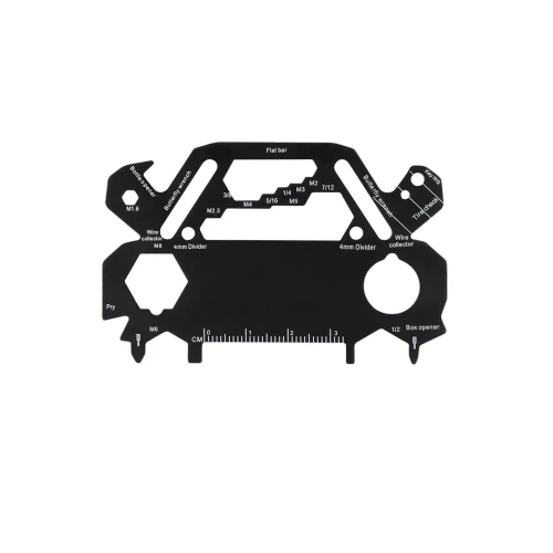 Original y práctica multiherramienta en acero inox con forma de coche. Con 30 funciones, entre otras: destornillador de punta plana y philips, llave para tuercas hexagonales en varios tamaños, regla y abrebotellas.