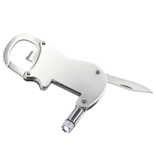 Multiherramienta metálica 4-en-1 con Linterna LED, Navaja, Destapador y Mosquetón.