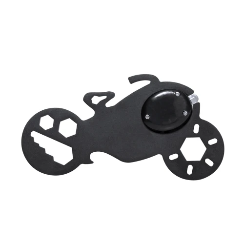 Original y práctica multiherramienta en acero inox con forma de motocicleta. Con 11 funciones, entre otras: llave para tuercas hexagonales en varios tamaños y abrebotellas. Además, con linterna de 1 LED alimentada por pila de botón. Presentado en bolsa de papel reciclada.