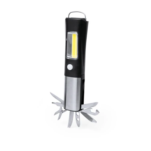 Práctica multiherramienta fabricada en resistente ABS y acero inox, con linterna frontal integrada de 1 LED. Incluye linterna lateral de 19 luces COB con dos posiciones de ilumincación (fija e intermitente). Dispone de 13 funciones, entre ellas cuchillo liso, de sierra, destornillador philips, tijeras, destornilladores planos, llave para tuercas hexagonales en varios tamaños, abrelatas, abrebotellas y una lima. Con imán de fijacion y asa. Alimentada con 3 pilas AAA, no incluidas. Presentada en caja de diseño kraft.