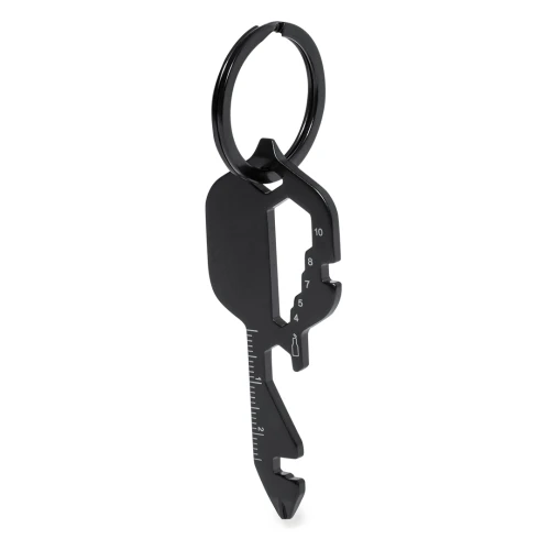 Original y práctica multiherramienta con llavero en acero inox. Con 13 funciones entre otras, destornillador de punta plana y philips, llave para tuercas hexagonales en varios tamaños, regla y abrebotellas. Presentado en sobre de cartón.