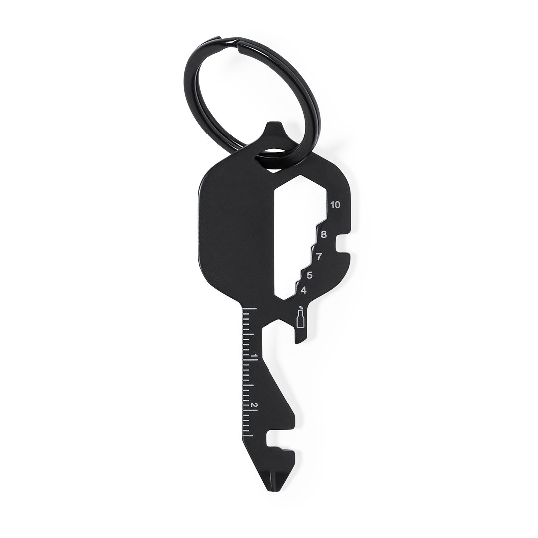 Original y práctica multiherramienta con llavero en acero inox. Con 13 funciones entre otras, destornillador de punta plana y philips, llave para tuercas hexagonales en varios tamaños, regla y abrebotellas. Presentado en sobre de cartón. 13 Funciones