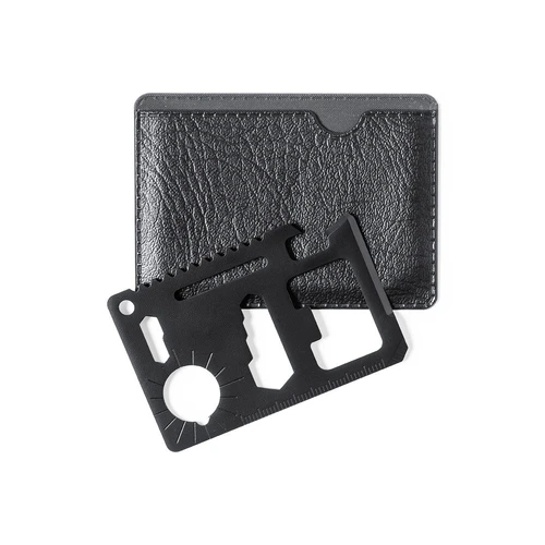 Multiherramienta con resistente cuerpo en acero inox con 11 funciones. Con funciones abrelatas, cuchillo, destornillador, regla, abrebotellas, llaves inglesas, llaves de mariposas, sierra e indicador de dirección. Presentada en resistente funda de polipiel.