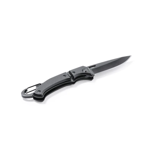 Navaja con hoja en acero inox de acabado negro y resistente empuñadura a juego en aluminio. Con mosquetón integrado en mango y bloqueo de seguridad. Con troquelado en hoja para una fácil apertura y presentada en caja individual de diseño negra.