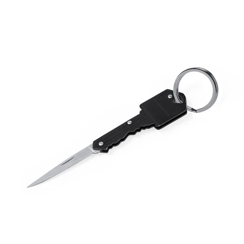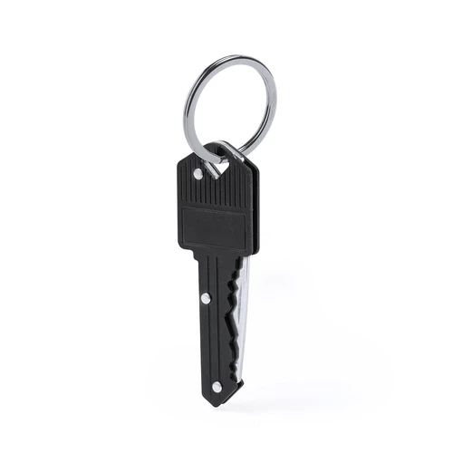 Distinguida navaja en forma de llave fabricada en aluminio y acero inox. Con anilla para llavero y hoja plegable. Presentada individualmente en caja kraft.