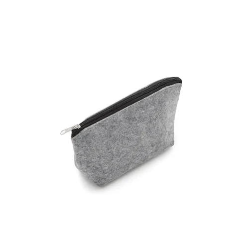 Neceser de fieltro RPET en color gris, confeccionada a partir de botellas recicladas. Dimensiones: 21 x 12 x 6,5 cm. Ideal para transportar los elementos de cuidado personal en viajes y bolsos de deporte. ReUseMe