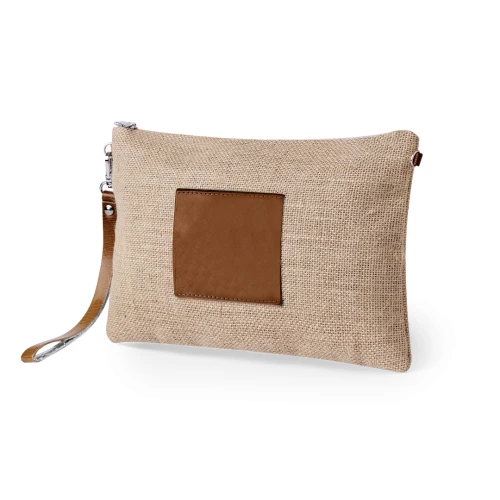 Neceser multiusos en combinación de yute laminado y polipiel. Con cierre de cremallera, tirador metálico y marco central a juego en polipiel de color natural. Presentado en bolsa individual.