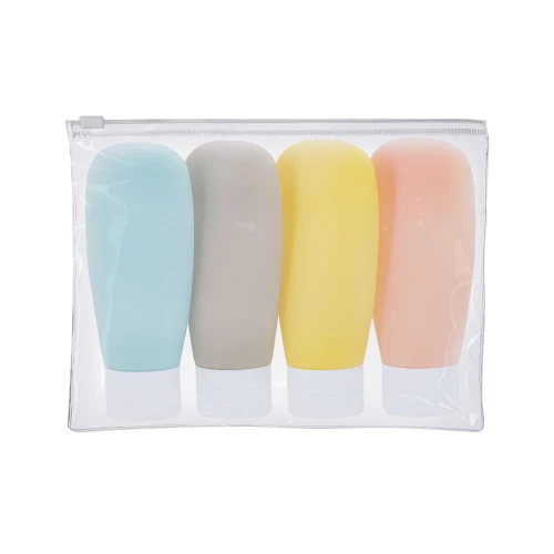 Neceser de viaje con botes de PVC. Incluye 4 botes de 60 ml de capacidad, en diferentes colores (rosa, azul claro, amarillo y gris) y suave acabado gomoso, ideales para organizar líquidos y productos de cuidado personal. Presentado en neceser transparente de PVC con cierre hermético.