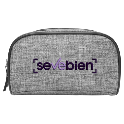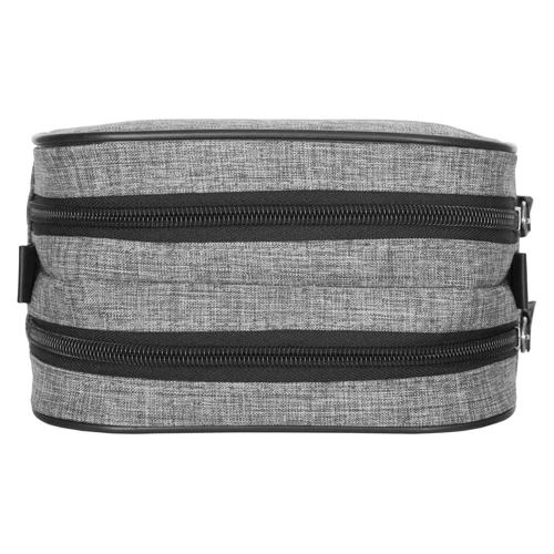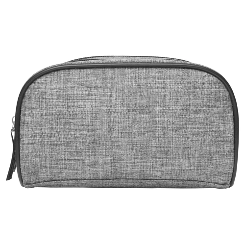 19 x 10 x 9,5 cm. Polyester. Necessaire de dos compartimientos, división movible sujeta con velcro. Detalles en símil cuero. Interior con forro. Tiradores de cierres de símil cuero.