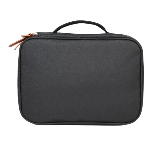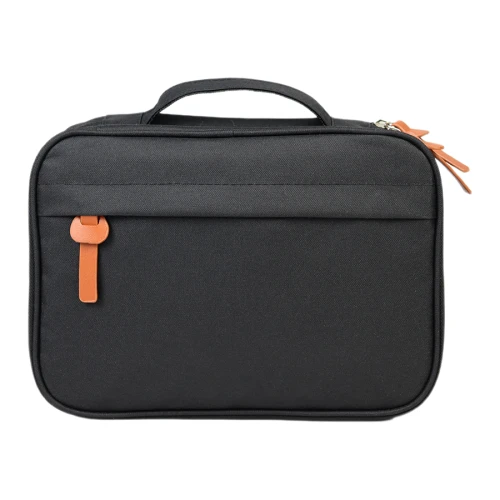Necessaire bolso cosmetiquero colgante grande, doble compartimento, en tela poliéster 300D/PVC. Incluye bolsillo delantero con cremallera y tirador de eco-cuero. Un infaltable en tu baño y tus viajes.