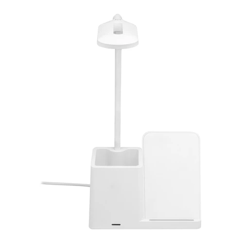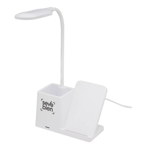Ilumina y organizaLámpara de escritorio con portabolígrafos y cargador inalámbrico para teléfono móvil. Posee 3 modos de luz: cálida, fría y tenue. Cuello flexible. Carga rápida inalámbrica de 15w. Conector tipo USB-C.