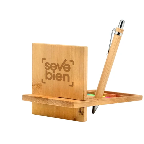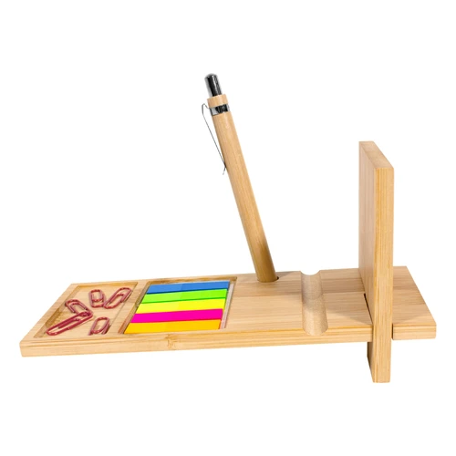 19,5 x 8,5 x 0,7 cm. y 10 x 8,5 x 0,7 cm. Bambú. Organizador de escritorio compuesto por dos piezas encastrables con compartimentos para accesorios y ranuras porta boligrafo y porta celular. Parte posterior también funciona como soporte porta celular. Incluye bolígrafo (cuerpo de bambú, pulsador, clip y detalles metálicos, tinta negra), set de 5 señaladores autoadhesivos de diferentes colores y clips en color rojo. Ideal para acompañar tus tareas tanto en la oficina como home office. PRESENTADO EN CAJA DE REGALO.
