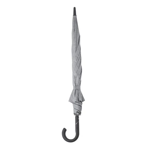 Paraguas de alta calidad y 130cm de diámetro, fabricado en material poliéster 150D y en elegante tono gris jaspeado. Apertura automática y varillas de fibra de vidrio, con sistema antiviento y cierre de velcro. Con mango ergonómico en suave ABS y presentado en bolsa reciclada.