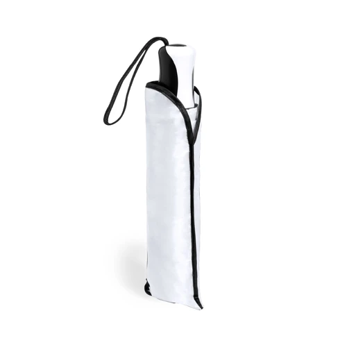 Paraguas plegable de 8 paneles de poliéster 190T. De apertura manual, con varillas metálicas en color plateado y cierre de velcro. Mango ergonómico con cinta de transporte y funda protectora a juego. Disponible en amplia gama de colores. Presentado en bolsa individual reciclada.