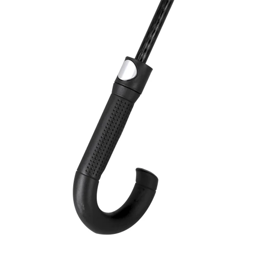 Paraguas antiviento fabricado en RPET 190T de 8 paneles, con elegante diseño en color negro con ribetes reflectantes. De 120cm de diámetro, con apertura automática y en resistente material pongee. Con varillas en fibra de vidrio en color negro, cierre de velcro y mango en PP. Incluye funda con correa ajustable para fácil transporte y distintiva etiqueta RPET.