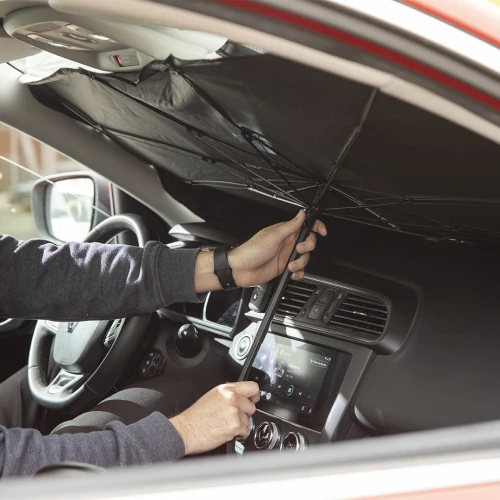 Parasol plegable para coche. Medida de 140x78cm. Con mecanismo de apertura manual y funda de políester incluida