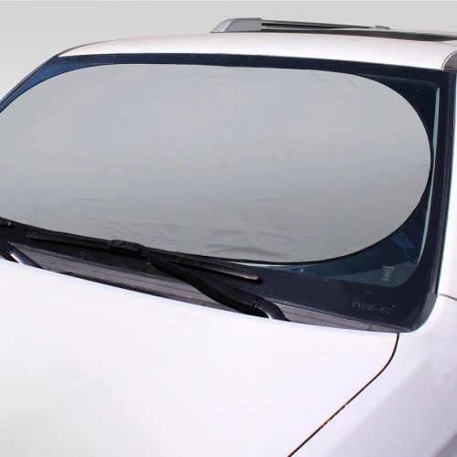 Parasol plegable de nylon plateado para el vehículo. Presentación dentro de funda redonda de nylon plateado. Gran área para impresión.